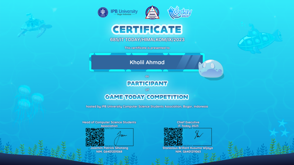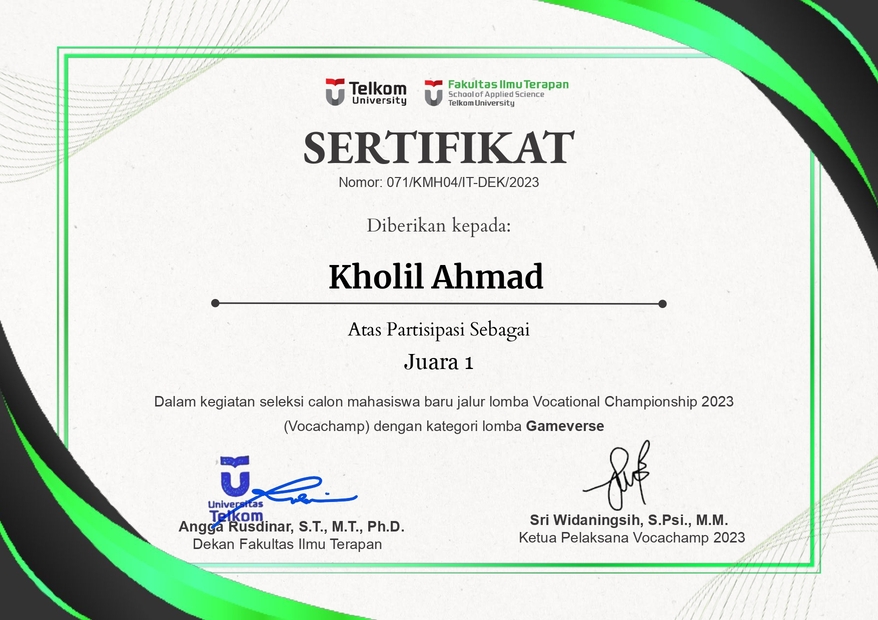 My other name is Kadev, or Kholil Ahmad Developer. I come from Solo, Central Java. I am the recipient of the Vocachamp 2023 superior scholarship at Telkom University, Digital Creative Multimedia Department. My expertise is photo/video editing, game development, and coding. I have experience in developing games solo and as a team.